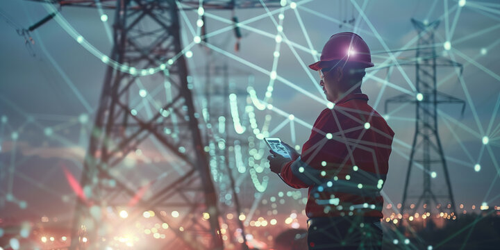 Electric power station. Electrical engineer using smart control panel to manage grid station