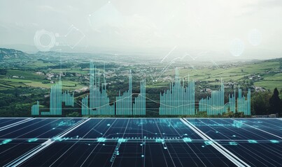 Rural landscape with solar panels and data overlay