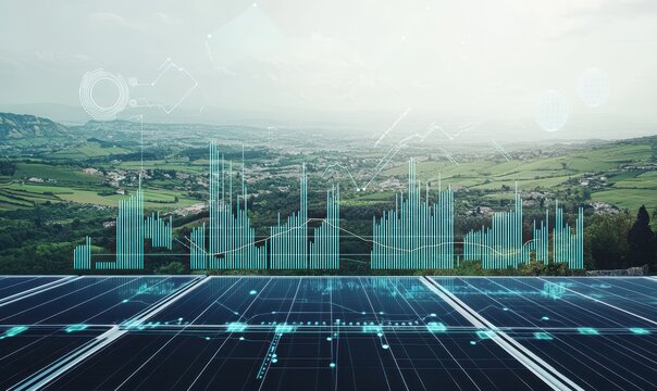 Futuristic solar panels in city with glowing data visualization