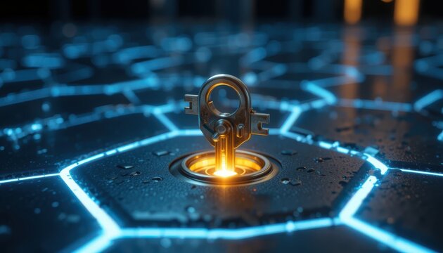 Abstract digital key unlocking technology on hexagon network background