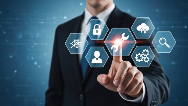 Businessman Interacting with Digital Service Icons for Business Management and Technology Solutions data center