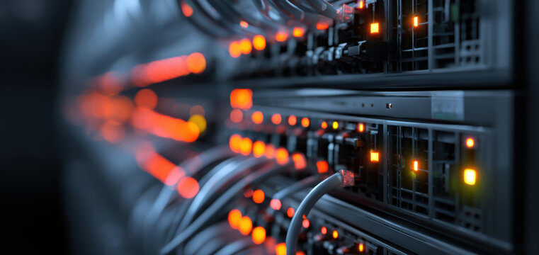 A modern server room featuring rows of illuminated servers, showcasing advanced technology and a sleek, organized environment.