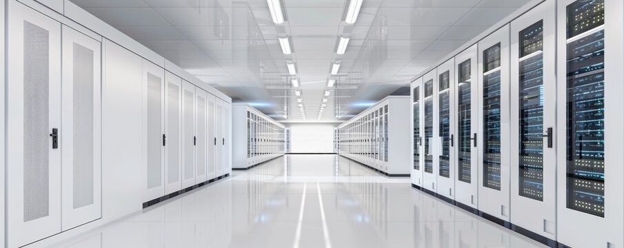 Modern data center with white and blue server racks in rows in the interior, high tech internet cloud technology concept.