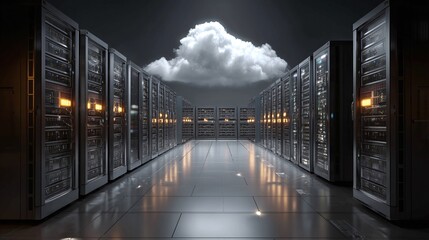 Server room with cloud computing concept. Rows of server racks symbolizing cloud infrastructure and data storage in a modern data center.