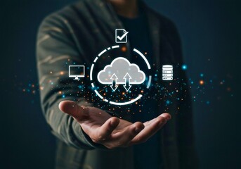 A hand presents a digital cloud with upload/download arrows, surrounded by icons representing data, security, and processing, illustrating cloud computing services.
