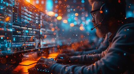Person working at multiple computer monitors in a dimly lit space, showcasing vibrant colors and data analytics, highlighting a busy tech environment in the evening