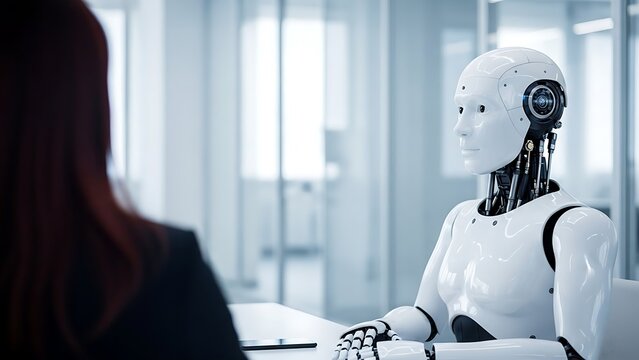 Futuristic humanoid robot in a business meeting with a human in a modern office setting discussing technology and innovation