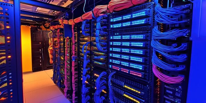 Close-up of glowing server racks and network cables in a futuristic data center, representing high-tech infrastructure, networking, and data storage.