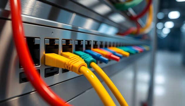 Close up view of a network switch with multiple colorful ethernet cables plugged into ports illustrating digital communication and data transfer