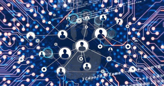 Image of network of digital icons over data processing against blue background