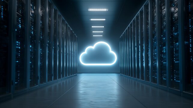 Illuminated neon cloud symbol glows brightly in a futuristic server room, symbolizing digital transformation and cloud computing innovation
