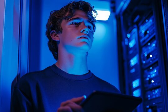 a young person inspecting a server room while holding a tablet, focused on the technology around them, with a contemplative expression