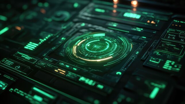 Futuristic control panel with a glowing green circular ui and holographic data visualizations, conveying advanced technology, cyber security, ai analytics and network monitoring