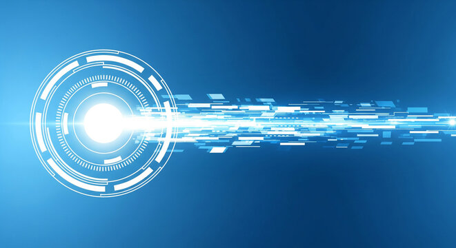 A futuristic circular HUD element emits a high-speed stream of blue data particles, a perfect abstract for technology, data transfer, and digital concepts