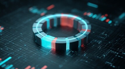 A close-up of a futuristic D donut chart with segmented, glowing parts, floating above a digital grid, representing complex financial data