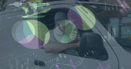 Image of statistics and financial data processing over delivery man and van
