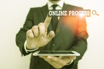 Handwriting text Online Process. Conceptual photo An automated way to enter and process data or reports Male human wear formal clothes present presentation use hi tech smartphone