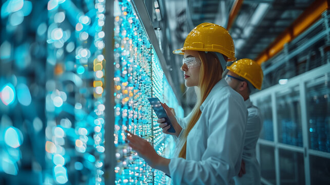 Factory Digitalization: Two Industrial Engineers Use Tablet Computer, Visualize the Wall of Big Data Statistics, Optimization of High-Tech Electronics, Generative AI