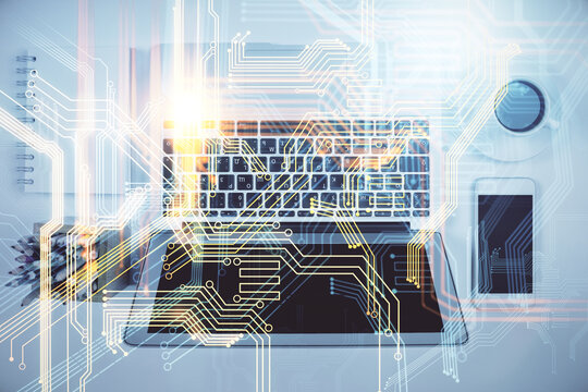Double exposure of map hologram drawing over study table background with computer. Concept of international network. Top view.