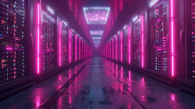 Server room with pink neon lights, futuristic data center interior. Cyber security and technology concept