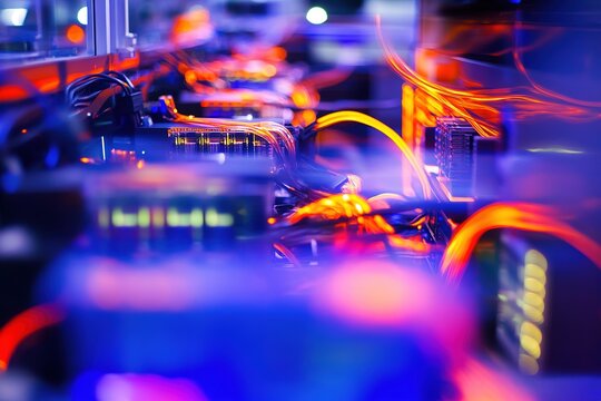 high-tech server room filled with big data processing units with blurred glowing cables adding depth