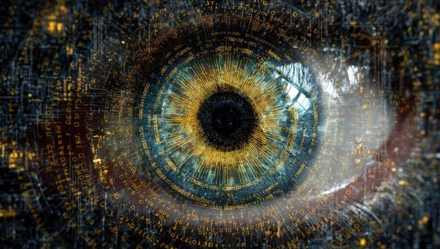 Abstract digital grid with circular interface elements and glowing lights. Futuristic tech network graphic with interconnected nodes and lines, representing data flow.