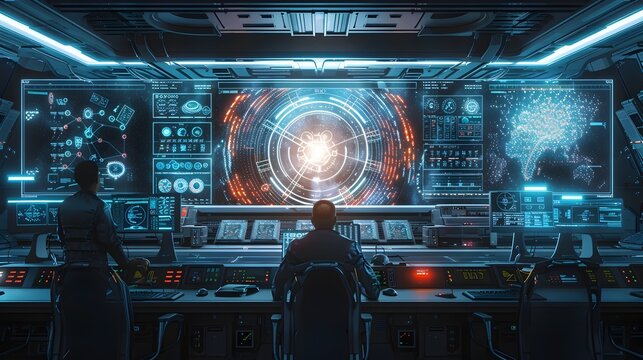 Futuristic Control Room with AI Algorithms Processing Complex Data for Text Overlay