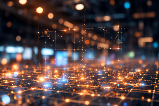 Abstract futuristic network grid of glowing dots and lines, representing data flow in a technological environment, creating an intricate digital pattern.