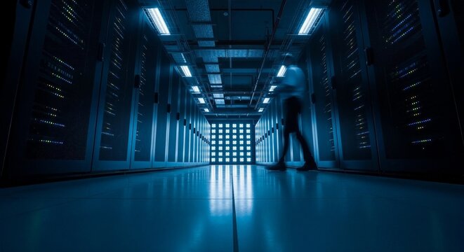 Expansive futuristic dark server room corridor with glowing blue lights and rows of data racks creating a sense of advanced technology