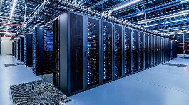 Server room with rows of server racks with blinking lights in a data center. Hosting, supercomputer, cloud computing, big data storage and internet concept. Futuristic technology background