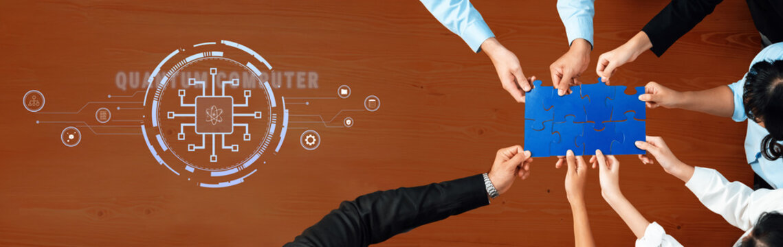A diverse group of professionals collaboratively working on quantum computing concepts, showcasing teamwork and innovation in a modern office environment. Trope