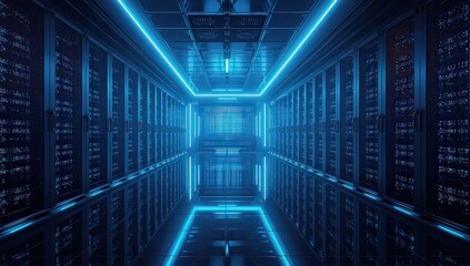 A mesmerizing 3d rendering of a futuristic server room illuminated with vibrant blue neon lights, creating a captivating and hightech atmosphere for data processing