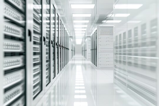 White server room with racks of data equipment, depth