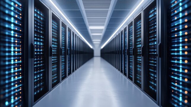 A modern data center corridor lined with server racks featuring illuminated indicators and a sleek, high-tech environment.