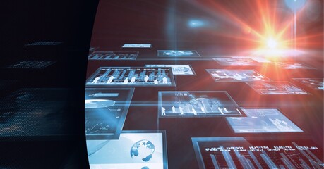Image of graphs and diverse data processing on navy black screen