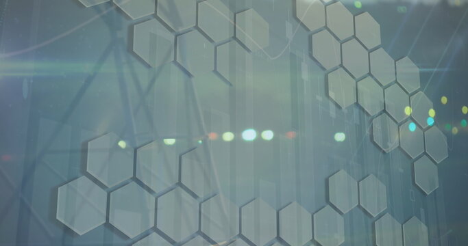 Image of data processing over cityscape and shapes