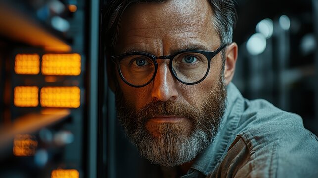 Streaming data overlays on server racks in data center, with cables, blinking LEDs and fingerprints