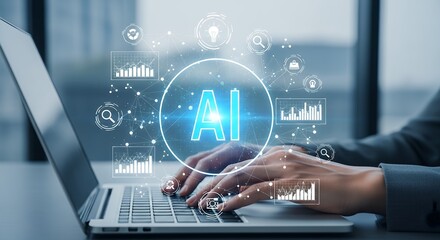 Artificial Intelligence Technology Concept Person Typing on Laptop with AI Data Visualization Overlay for Business Analysis and Future Innovation