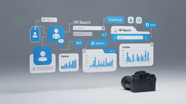 Diagram floats, showcasing HR search flow with data visualizations and a camera on a surface