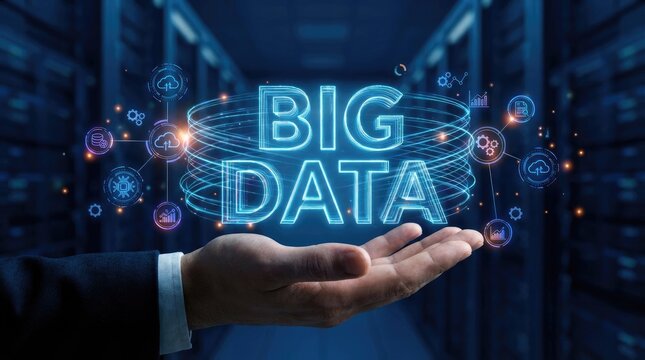 Hand holding glowing BIG DATA text and network of icons in server room big data technology