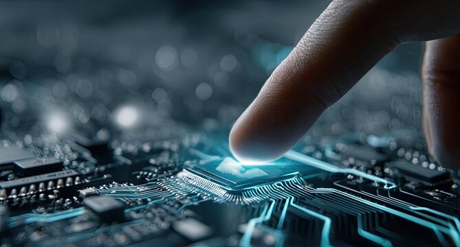 A hand's fingertip touches a glowing processor chip on a circuit board