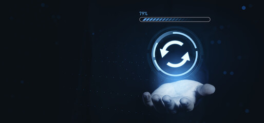 Futuristic digital update progress concept with glowing sync icon above open hand on dark background with blue tech elements.