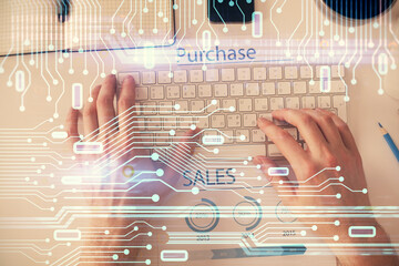 Double exposure of man's hands typing over computer keyboard and tech theme hologram drawing. Top view. Technology concept.