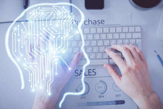 Double exposure of man's hands typing over computer keyboard and brain hologram drawing. Top view. Ai and data technology concept.