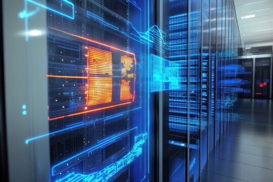 Futuristic server room glows with blue, orange lights, showcasing rows of computer racks. Digital overlay with network connections, glowing circuits suggests advanced automation, AI, data processing.