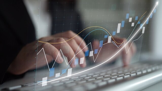 A close-up view of hands typing on a laptop, illustrated with an overlay of a rising graph and trend line, symbolizing business growth and modern financial analysis. Copula