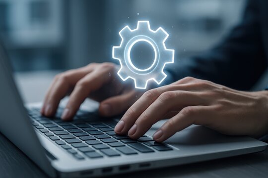 Technology Configuration in Action: A close-up view of hands on a laptop keyboard, with a glowing gear icon overlaid, depicting tech configuration