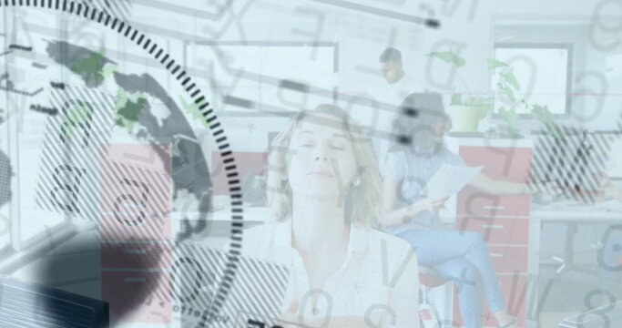 People collaborating during a business meeting in a modern office. Surrounded by futuristic overlay of data analytics processing. Digital technology. And corporate growth charts