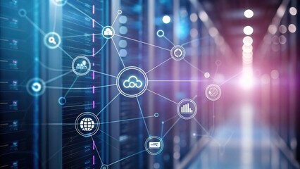 A digital network design overlaying a server room, featuring cloud icons and data connections, symbolizing data management and technology.