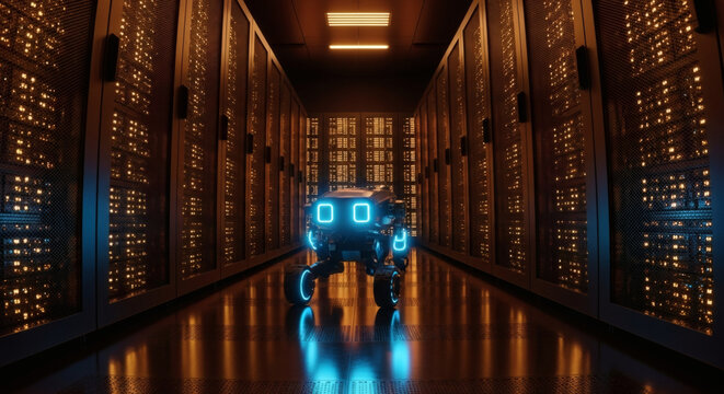 Futuristic digital data processing in dimly lit server room